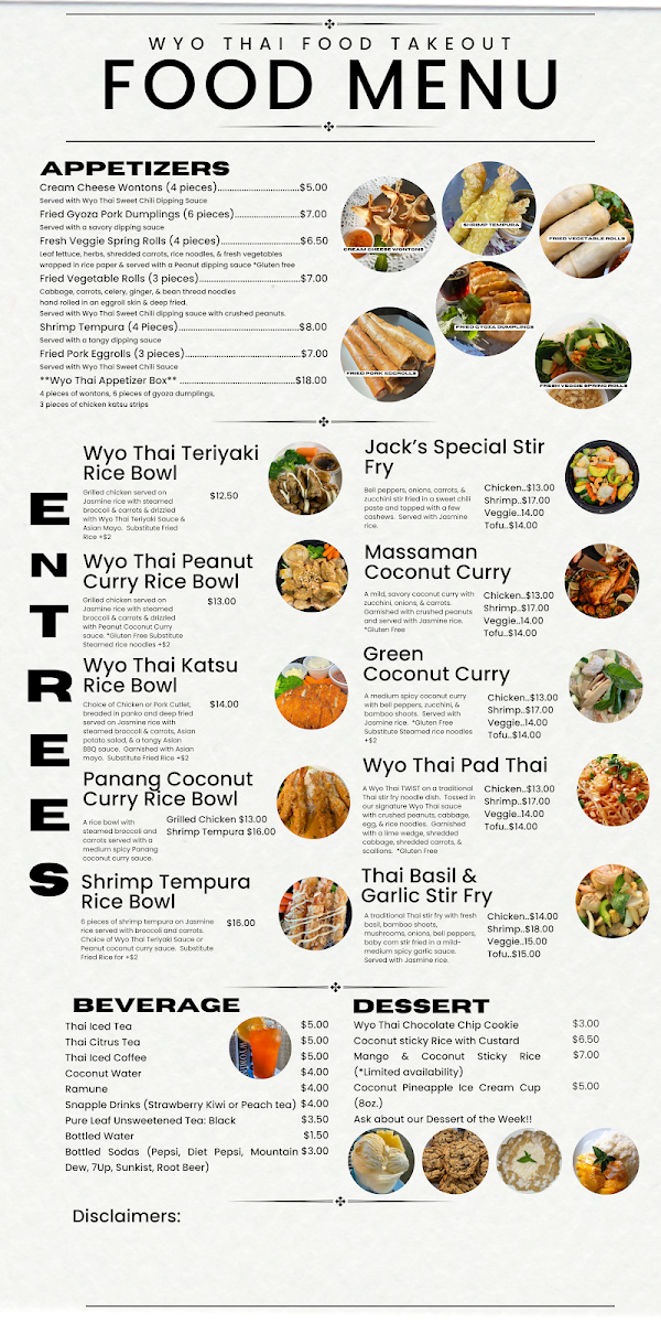 Welcome to WYO Thai Food Takeout, a cherished addition to Sheridan, WY, where the vibrant flavors of Thailand come to life. Located at 1037 N Main St, this establishment has quickly become a local favorite, with a menu that promises authentic dishes prepared with fresh, high-quality ingredients.